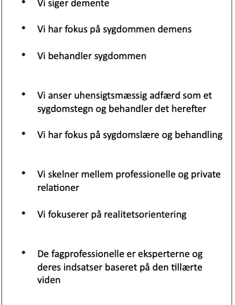 Dette perspektivskifte og de afledte effekter er stadig undervejs, og det vil tage en rum tid, inden vi når målet. Nedenfor har vi sammenfattet disse aspekter skematisk (frit efter Tom Kitwood):